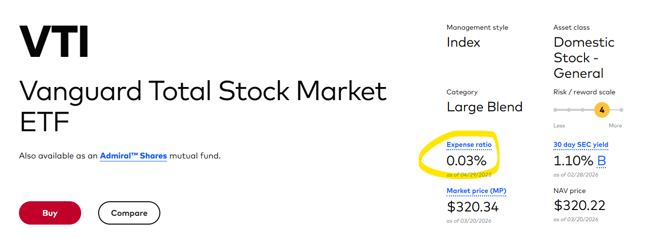 VTI, Vanguard’s Total Stock Market ETF, carries a 0.03% expense ratio. It tracks the Center for Research in Security Prices (CRSP) US Total Market Index, covers virtually the entire U.S. equity market, and is available at any brokerage. Three cents per $100 invested per year. The advertised fee is not always the whole story. Some funds offset a low headline ratio through securities lending revenue or by tracking a proprietary index that diverges from standard benchmarks. The expense ratio is what you see. The total cost of ownership is what you pay. For a fund like VTI, those two numbers are effectively the same. That is the standard worth measuring against.